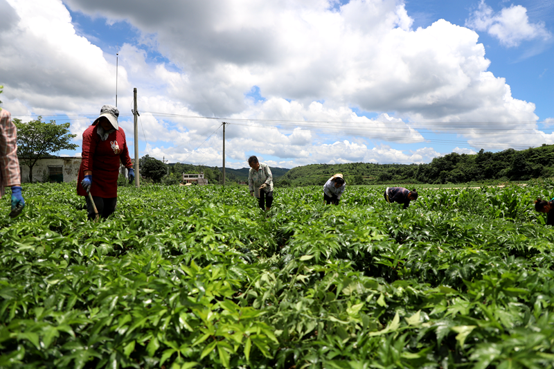 仲夏七月,萬物繁茂。走進(jìn)修文縣久長街道永楊村,連片的玉米地、辣椒地綠意盎然,中藥材基地更是生機(jī)勃勃,呈現(xiàn)出一派喜人的豐收景象。在永楊村200畝的中藥材當(dāng)歸基地里,淡淡的藥香彌漫在田間地頭,令人神清氣爽。工人們正趁著晴好天氣,忙碌而有序地為當(dāng)歸除草?!斑@一…
